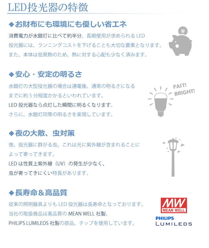 また、キャンプ場照明 ゴルフ場照明 サッカーグラウンドなどの大型照明や、屋外イベントや看板のライトアップなどにも適しています。