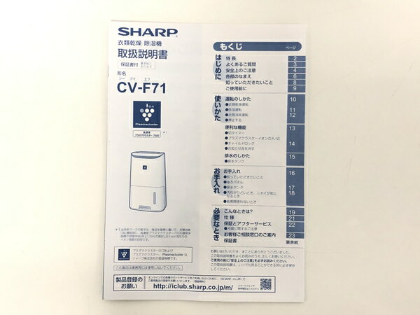 【中古】 SHARP シャープ CV-F71-W プラズマクラスター 除湿機 良好 F3835416