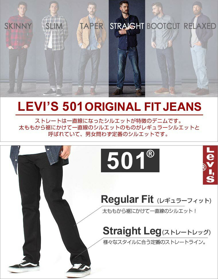 Levi's501ジーンズならではの一直線でストレートのシルエットもポイントで、太すぎず細すぎない定番スタイルが人気となっております。