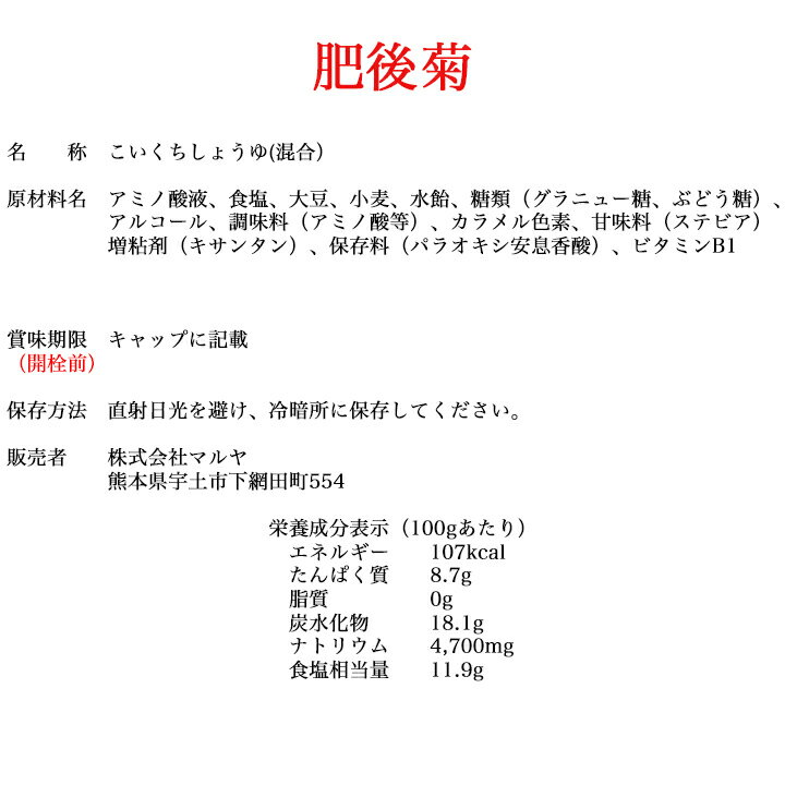 肥後菊 1800ml マルヤ《九州 熊本 【湧き水】で造った 【肥後菊】》【製法特許登録商品】【低塩仕込】とにかく味を追求するあまりに、調味料という枠を超える意気込みで旨味深味コクを抽出することに成功し製法特許まで取得したこだわり抜いた逸品です!!